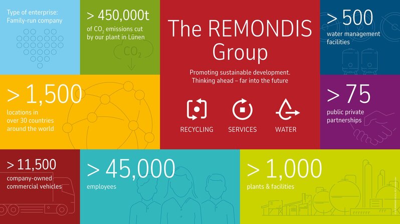 The REMONDIS Group operates in many fields of business: it recovers raw materials from waste, develops innovative recycled products, offers alternative fuels and plays an important role in the water management sector supplying water and treating wastewater. In addition, REMONDIS removes pollutants from residual and hazardous wastes – which are unable to be recycled with today's technology – and disposes of them using eco-friendly methods.