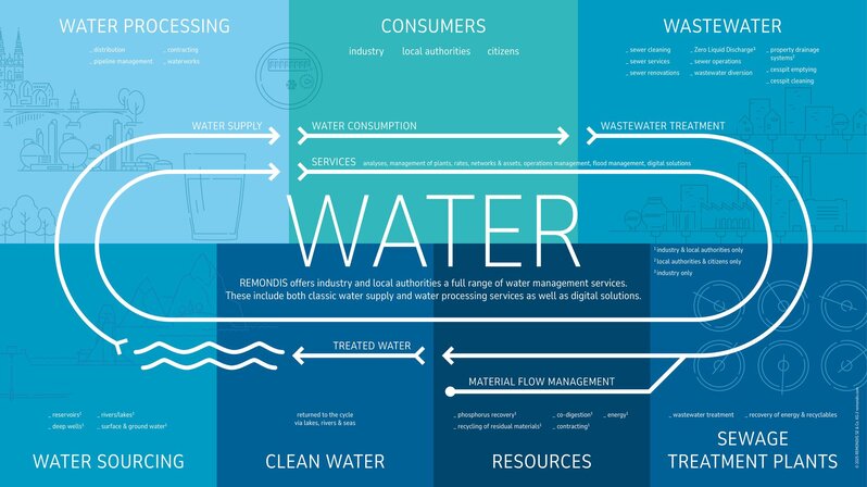Hos REMONDIS er helhedstanken det vigtigste princip, hvilket oversigten over vores ydelser inden for vand bekræfter. Her afdækker vi hele spektret af de ydelser, som industrien, kommunerne og borgerne efterspørger. Det starter med udvinding og rensning af proces- og drikkevand og fortsætter med rensning af spildevand i vandrensningsanlæg eller direkte ude i industrivirksomheden. Det kræver innovative løsninger at gennemføre processerne, en moderne tilgang og serviceorienterede ydelser at opretholde den værdifulde ressource som vand og beskytte miljøet. Læs mere om vores arbejde og lær os at kende.